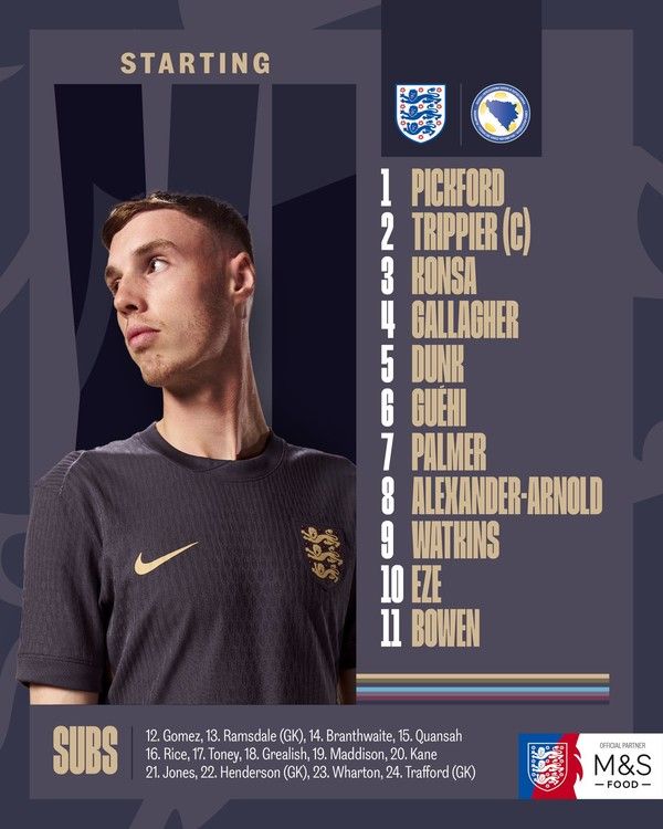 홈팀 잉글랜드는 4-2-3-1 전형으로 나섰다. 올리 왓킨스가 최전방을 책임졌고 에베레치 에제, 콜 파머, 재러드 보언이 공격을 지원했다. 코너 갤러거, 트렌트 알렉산더아놀드가 중원을 구성했고 키어런 트리피어, 마크 게히, 루이스 덩크, 에즈리 콘사가 수비라인을 구축했으며 조던 픽포드가 골키퍼 장갑을 꼈다.