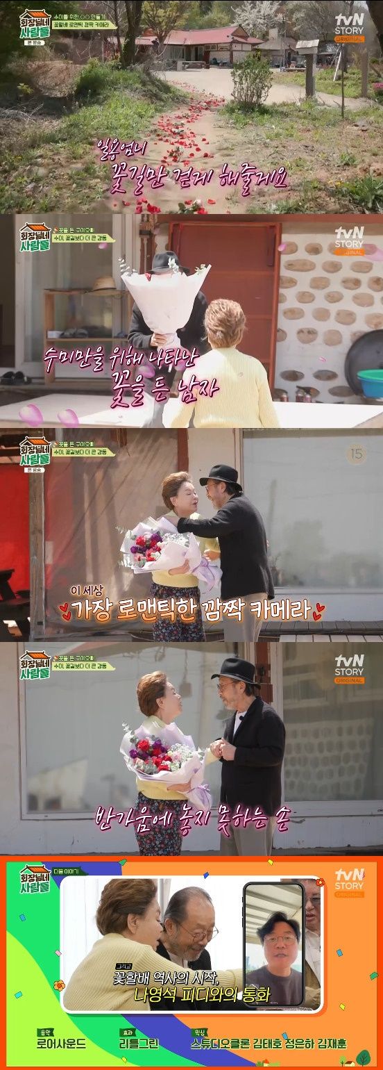 집에서 상황 살피며 뿌듯한 듯 지켜보는 이순재, 김용건, 박근형과 밖에서 꽃을 들고 김수미를 기다리는 신구는 가장 로맨틱한 깜짝 카메라를 완성했다.