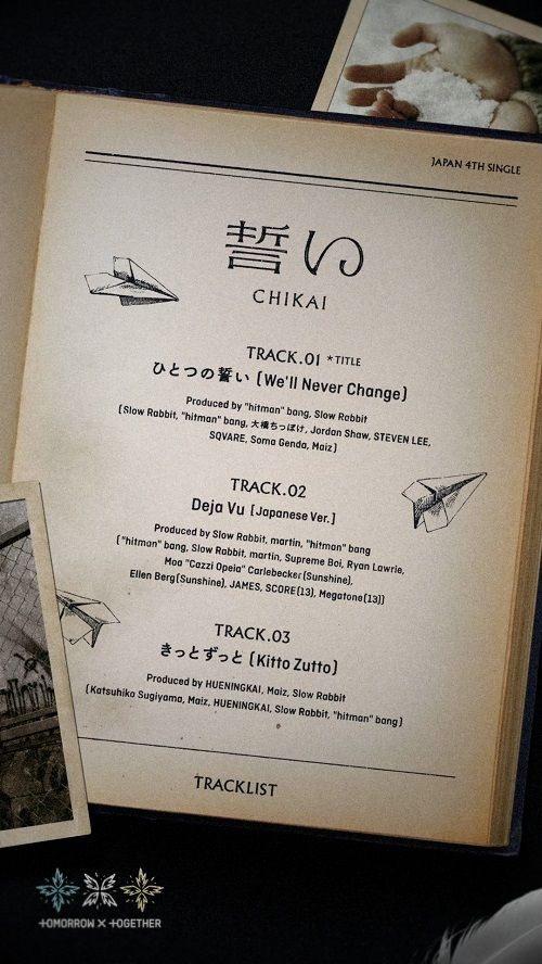 오는 7월 3일 발매되는 일본 싱글 'CHIKAI'(誓い/치카이)에는 신곡 'We'll Never Change', 'Kitto Zutto'와 함께 한국 음반 'minisode 3: TOMORROW'의 타이틀곡인 'Deja Vu'의 일본어 버전 등 총 3곡이 수록된다. 'CHIKAI'의 타이틀곡은 'We'll Never Change'다. 투모로우바이투게더(수빈, 연준, 범규, 태현, 휴닝카이)의 일본 음반 최초로 오리지널 신곡이 타이틀곡으로 선정돼 현지 팬들의 관심이 뜨겁다.