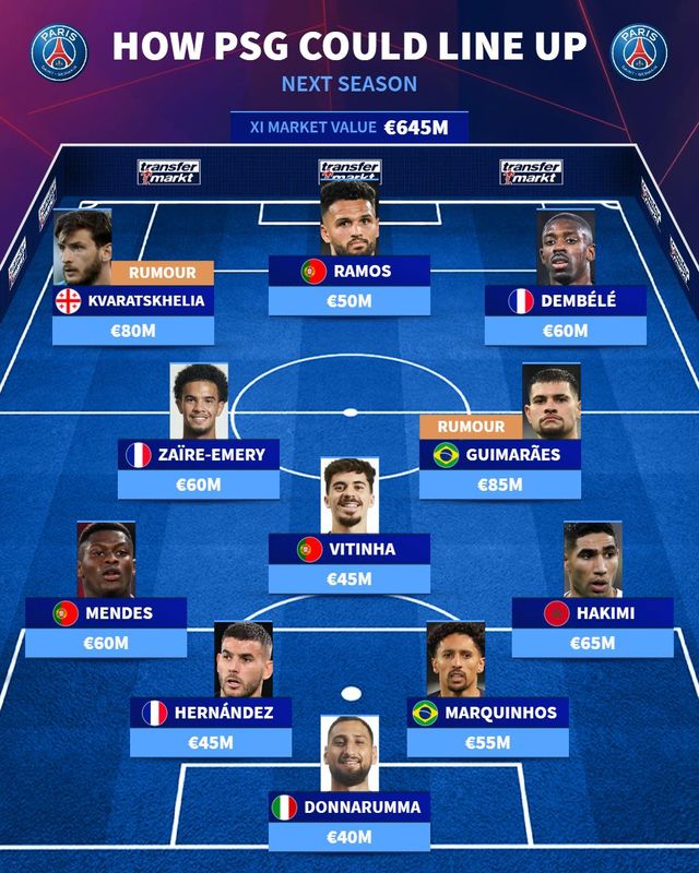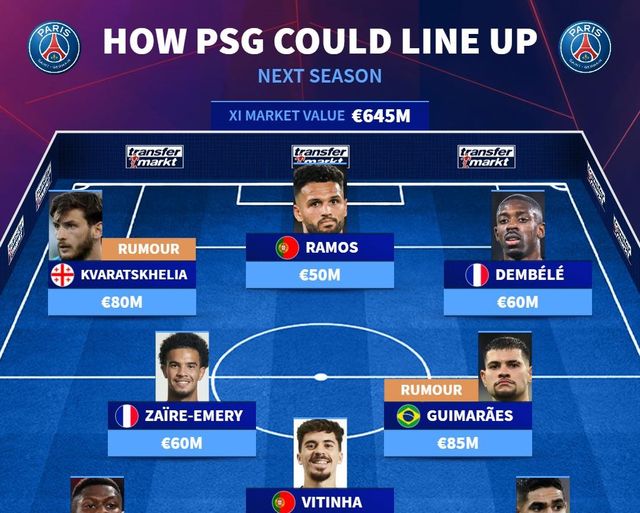 음바페 대체자로 크바라츠헬리아가 유력해진 상황에서 트랜스퍼마르크트는 크바라츠헬리아가 합류한 다음 시즌 PSG 예상 라인업을 소개했다.