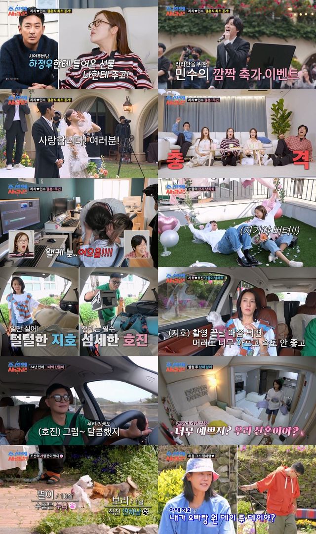 3일(월) 방송된 ‘조선의 사랑꾼’에서는 ‘엔조이 커플' 9년 차에서 '엔조이 부부' 1년 차가 된 임라라♥손민수가 오랜만에 등장했다. 엔조이 커플과 비슷하게 현재의 남편과 장기 연애를 했던 황보라는 "신랑의 경제적 독립까지 10년이 걸렸다"며 "고급 시계 선물받기까지 오래 걸렸다"고 고백했다. 또 "하정우한테 들어온 선물 나에게 가져다주고!"라는 폭탄 발언으로 폭소를 유발했다.