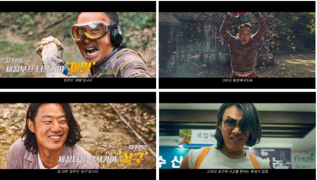 이상한 집들이 영상은 ‘제목이 <핸섬가이즈> 인데 핸섬 가이가 나오지 않는 영화가 있습니다’라는 내레이션으로 시작부터 웃음을 유발한다. 이어 자칭 세계 제일 미남 둘 재필과 상구, 착하지만 이상한 대학생 미나, 그리고 볼수록 이상한 경찰 최 소장과 남 순경의 등장을 예고해 독보적인 매력을 지닌 캐릭터의 등장을 알린다. 먼저 터프한 미남 스타일의 집주인 재필은 거칠게 벌집을 건드렸다가 호되게 당하는 모습부터 미나에게 말꼬리 끝을 올려가며 상냥하게 배려하는 모습까지 담겨 그의 새침부끄한 면모를 드러냈다. 또 다른 집주인이자 섹시한 미남 스타일 상구는 성난 근육을 뽐내며 섹시 댄스를 추는 상대가 반려견 봉구라는 점이 거친 모습 안에 감춰진 러블리함을 드러낸다. 특히 집 안에 들어온 말벌을 보고도 “반갑다고 인사 왔나보다”라며 초긍정적 에너지의 상구적 사고로 관객들을 무장해제 시킬 예정이다.