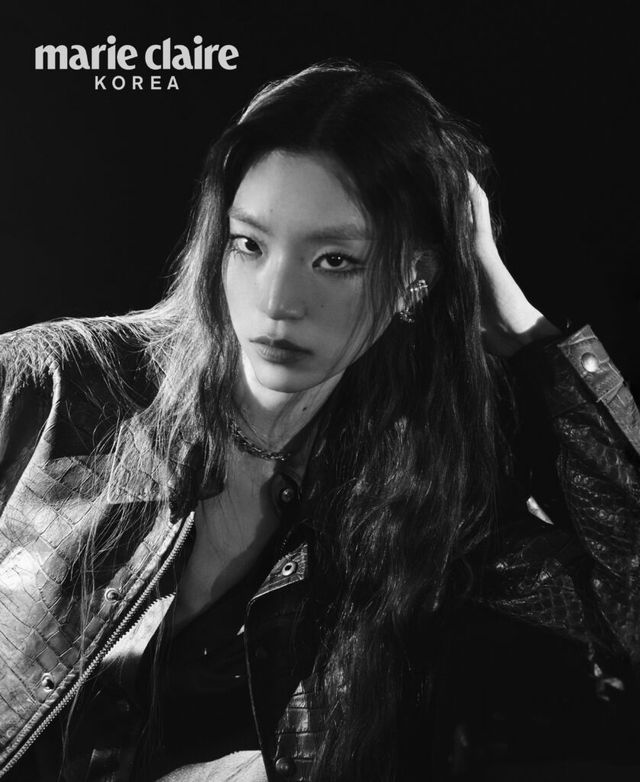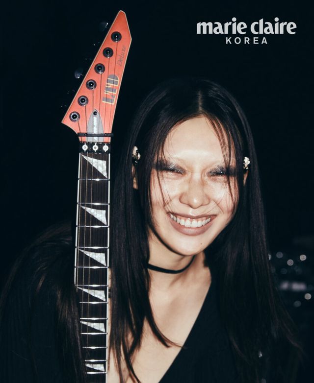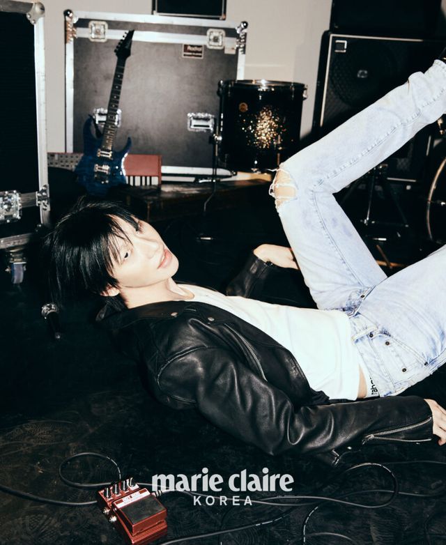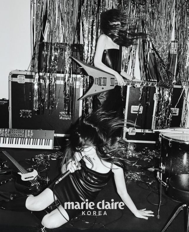 요셉 스트라이프 재킷과 셔츠, 실크 타이, 블랙 팬츠, 선글라스. 윤조 새틴 드레이프 점프수트, 블랙 웨스턴 부츠, 제이 트라페즈 미니드레스 모두