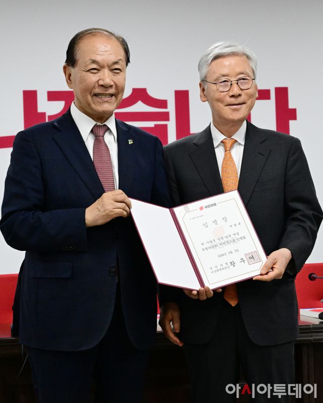 아시아투데이 이병화 기자 = 황우여 국민의힘 비상대책위원장이 4일 서울 여의도 국민의힘 중앙당사에서 열린 전당대회 당헌·당규 개정 특별위원회 임명장 수여식 및 1차 회의에서 여상규 특위 위원장에게 임명장을 수여하고 있다.