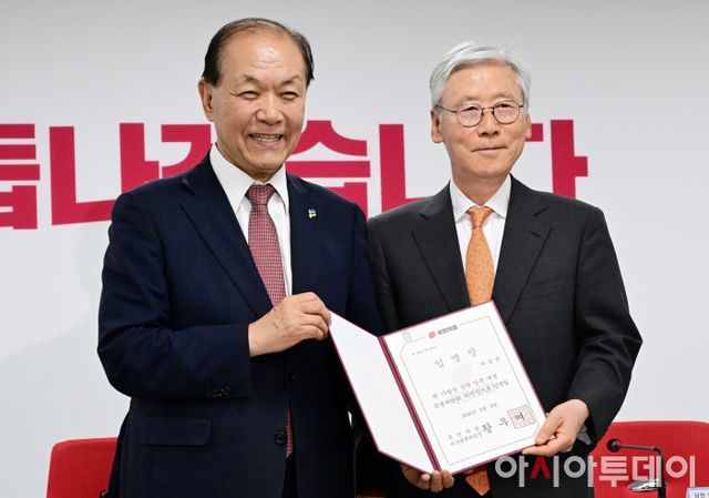 아시아투데이 이병화 기자 = 황우여 국민의힘 비상대책위원장이 4일 서울 여의도 국민의힘 중앙당사에서 열린 전당대회 당헌·당규 개정 특별위원회 임명장 수여식 및 1차 회의에서 여상규 특위 위원장에게 임명장을 수여하고 있다.