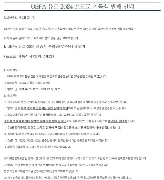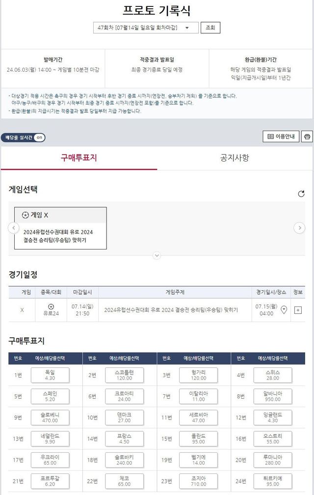 다만 발매기간 중 유로 경기가 진행되는 시간에는 발매가 차단되며, 익일 발매 재개 시 배당률이 조정되기 때문에 구매 시점에 따라 동일한 팀을 선택했더라도 배당률이 달라질 수 있다는 점에 유의해야 한다.