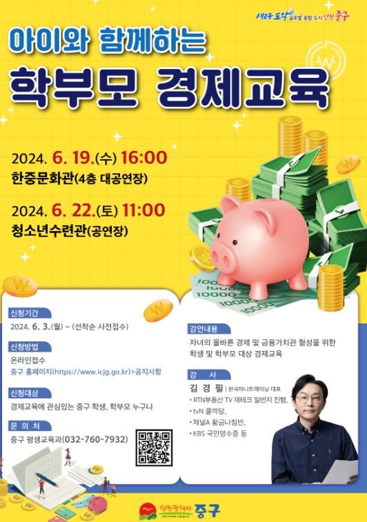 [파이낸셜경제=김예빈 기자] 인천시 중구는 오는 6월 19일, 22일에 경제 전문가 김경필 강사를 초청해 ‘아이와 함께하는 학부모 경제교육’을 개최한다.