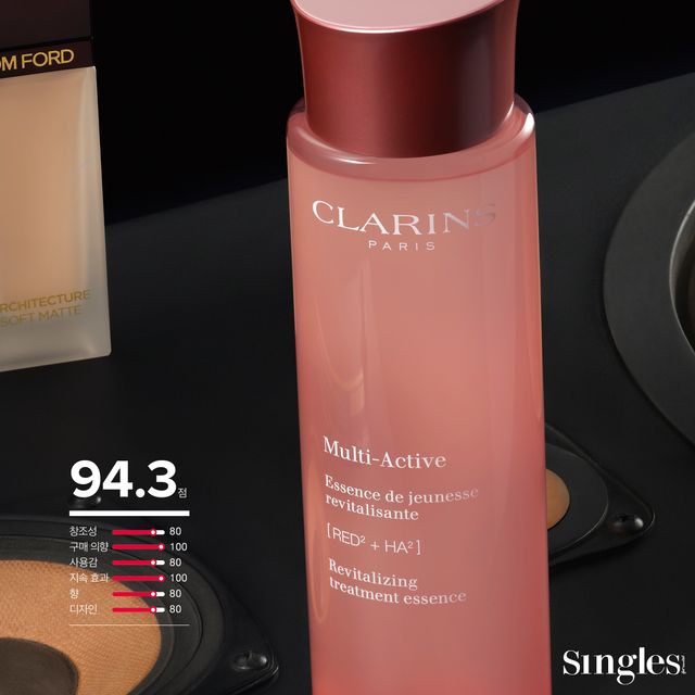 클라랑스 멀티-액티브 트리트먼트 에센스 첫 단계 세럼으로 수분과 영양 공급은 기본, 각질도 케어한다. 피부에 빠르게 스며드는 텍스처는 낮아진 피부 컨디션을 끌어올리면서 광채도 남긴다. 200ml 7만1000원.