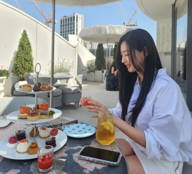 이어지는 사진에서 김사랑은 한 식당 테라스에서 럭셔리한 디저트를 즐기며 여유를 만끽했다.