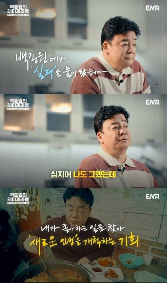 먼저 실패에 대해 백종원은 "실패를 겪었을 때 누구든 좌절이 먼저 온다. '내가 이것밖에 안 되나' 누구나 살면서 적게는 한두 번, 많게는 여러 번 위험요소로 갈 뻔한 위기를 겪는다"고 말했다.