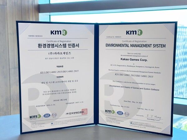 이러한 성과들과 지속적인 친환경 활동을 인정받은 카카오게임즈는 지난해 국내에서 가장 영향력 있는 ESG 평가기관 중 하나인 한국ESG기준원(KCGS) 주관 ESG 평가에서 게임업계 유일하게 ‘환경’ 부문 A등급을 획득한 바 있다. 또한, 올해 5월 국제표준 환경경영시스템 ‘ISO 14001′ 인증을 취득, 글로벌 시장에서 요구하는 환경경영시스템을 갖추고 체계적인 환경경영을 실천하고 있음을 인증 받았다.