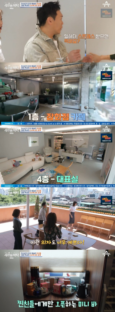 대표실 안쪽에는 개인 파우더룸에 샤워실까지 놀라움을 자아냈다. 1층은 잡화점과 통창 카페, 2층은 사무공간, 3층에는 직원 휴게공간이 마련됐고 4층은 대표실로 꾸며져 있었다. 지하에는 라이브 커머스 방송국도 갖추고 있었다. 안선영은 "직원은 50명 정도"라고 알렸다.