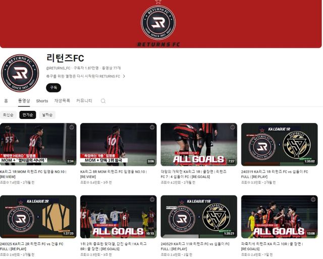 리턴즈FC 유튜브 채널에는 리턴즈FC 선수들을 소개하는 ‘RE:LOG-선수소개’를 비롯해 섭돌이 FC, 건융 FC, 고양 2030, 동고 FC, 레오 FC와의 경기, 하이라이트, 골장면, 인터뷰 등 골라 보는 재미까지 있는 다양한 콘텐츠가 업로드되어 있다.