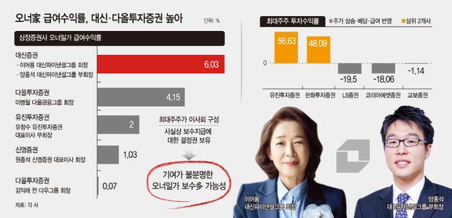 4일 상장증권사의 사업보고서에 따르면 작년 기준 대신증권 오너경영인의 급여수익률은 6.03%, 다올투자증권은 4.15%를 기록했다. 급여 수익률은 작년 말 기준 최대 주주가 보유한 주식 가치에 공시된 보수 규모(사업보고서)를 반영해 계산했다.