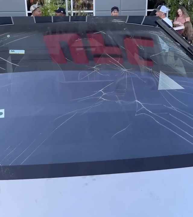 다음으로 사이버트럭 위에 올라간 사람은 앞 유리 중앙에 균열을 발생시키며 사이버트럭 피해 정도를 더욱 심각하게 만든다. 파노라마 선루프가 스케이트 보더의 바퀴와 무게를 견뎌냈는지는 알 길이 없다.
