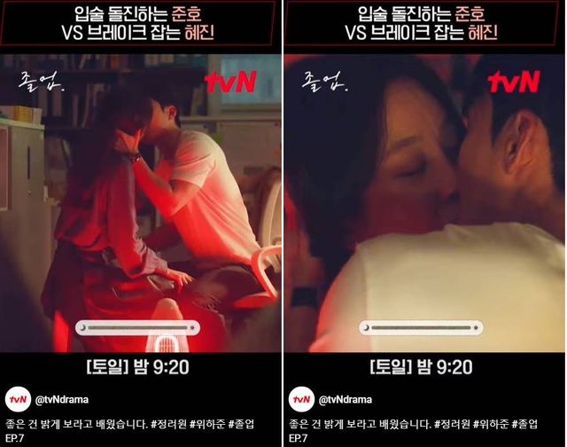 tvN 또한 들떴다. 공식 계정에 키스신 모음집을 올리는가 하면 "좋은 건 밝게 보라고 배웠습니다"라며 '친절히' 밝기를 올려주며 키스신을 공개했다.