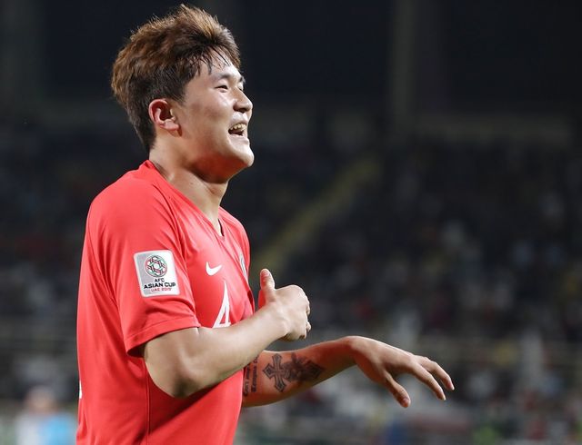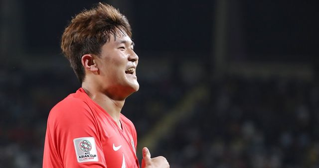 2019년 1월 16일 오후(현지 시각) 아랍에미리트 아부다비 알 나얀 스타디움에서 열린 한국과 중국의 아시안컵 조별리그 C조 3차전에서 후반 김민재가 헤딩골을 넣은 뒤 기뻐하고 있다. / 연합뉴스