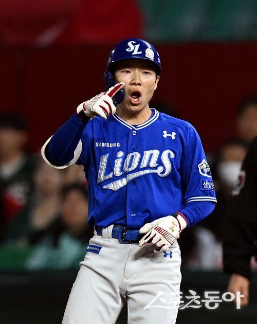 4일 인천 SSG 랜더스필드에서 ‘2024 신한 SOL 뱅크 KBO리그‘ SSG 랜더스와 삼성 라이온즈의 경기가 열렸다. 8회초 2사 1, 2루에서 삼성 김지찬이 1타점 동점 적시타를 날린 후 환호하고 있다. 인천 | 김민성 기자 marineboy@donga.com