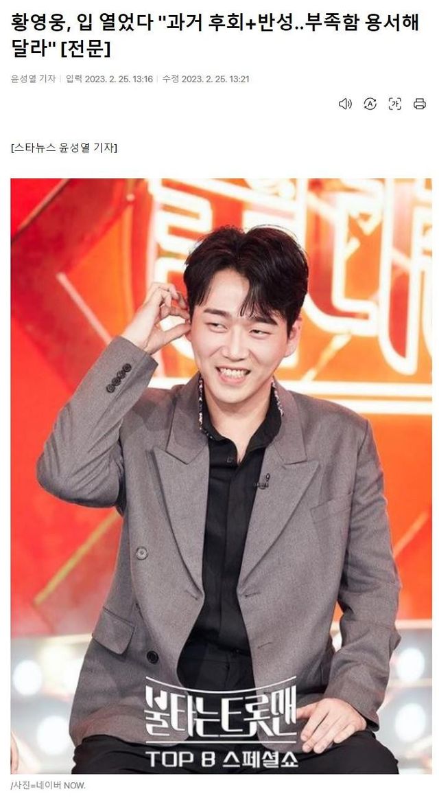 제가 비록 과거의 잘못이 무거우나 새롭게 살아가고자 하는 삶의 의지를 가지고 있습니다. 20대 중반이후 수년 간 공장에서 근무하며 성실한 삶을 배워왔습니다. 그리고 어린 시절 꿈이었던 노래를 다시 시작하고 불타는 트롯맨에 출연도 하게 되었습니다. 대중 앞에 나서게 되는 것이 너무 무섭고 두려웠습니다. 그러나 노래가 간절히 하고 싶었고, 과거를 반성하며 좋은 사회 구성원이 되고자 노력하고 싶었습니다. 방송 녹화를 하면서 매 순간 두려움과 고통 속에서 있었습니다. 지금 이 순간도 모든 것을 내려놓고 사라지고 싶은 마음입니다. 하지만, 평생 못난 아들 뒷바라지 하며 살아오신 어머니와 생계를 꾸리는 엄마를 대신해서 저를 돌봐주신 할머님을 생각하여 용기 내어 공개적인 사죄의 말씀을 드립니다.