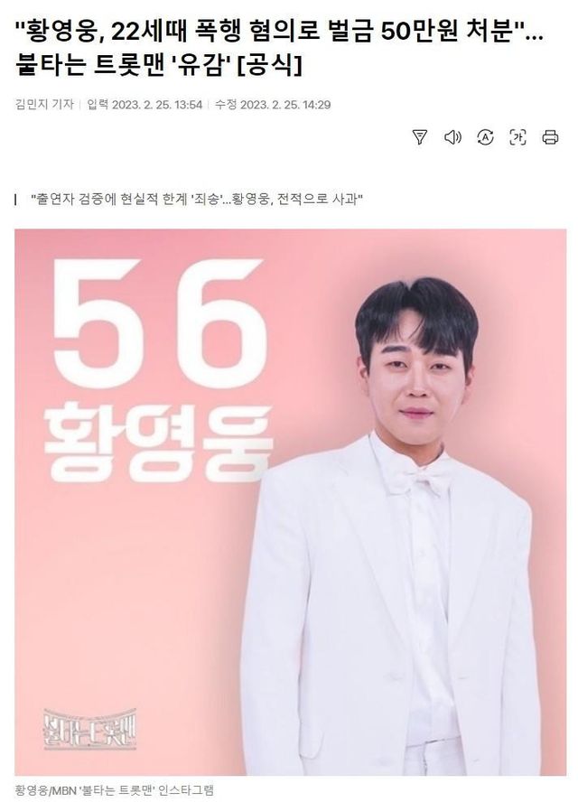 제기된 사안에 대해 황영웅(씨)는 다음을 확인해 주었습니다. 2016년(당시 22세), 황영웅(씨)은 검찰의 약식 기소에 의한 벌금 50만원 처분을 받았습니다.