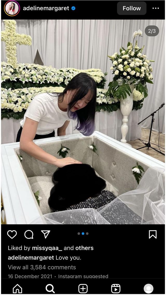 한 인플루언서가 장례식에서 고인 옆에서 포즈를 취하고 사진을 찍는