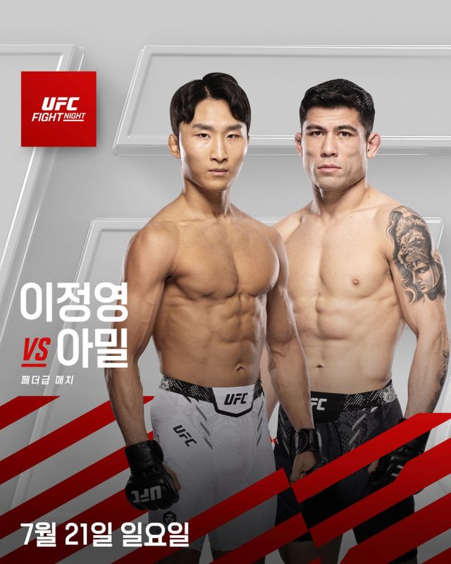 ‘코리안 타이거’ 이정영(11승 1패)은 ‘허리케인’ 하이더 아밀(34∙미국)과 페더급 경기를 치른다. ROAD TO UFC 시즌 1 우승자 이정영은 지난 2월 블레이크 빌더전에서 판정승을 거두며 성공적으로 UFC에 안착했다.