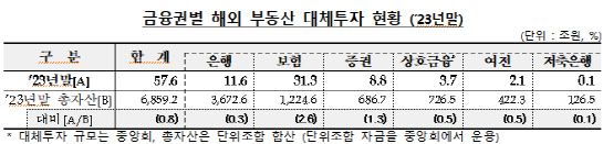 5일 금융감독원에 따르면, 국내 금융회사의 해외 부동산 대체투자 잔액은 작년 말 기준 57조6000억원으로 집계됐다. 금융권 총 자산의 0.8% 수준으로, 석 달 전보다 1조2000억원 증가했다.