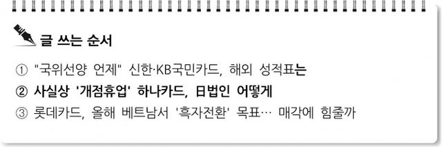 하나카드 관계자는 "올해 안에 라이선스를 취득해 일본 현지 사업에 집중하는 걸 목표로 하고 있다"며 "다만 현지 절차를 따를 수 밖에 없어 시기를 장담할 순 없는 상태"라고 설명했다.