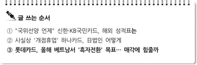 국내 실적이 반토막 난 점도 해외사업에 눈길이 가는 이유다. 롯데카드의 올해 1분기 순이익은 249억원으로 1년 전과 비교해 54.9% 감소했다. 신한·삼성·KB국민·현대·롯데·하나·우리카드 등 7곳 전업 카드사 가운데 1분기 순이익이 지난해보다 감소한 현대카드(-9.9%), 우리카드(-36.6%)와 비교해서도 감소폭이 가장 크다.