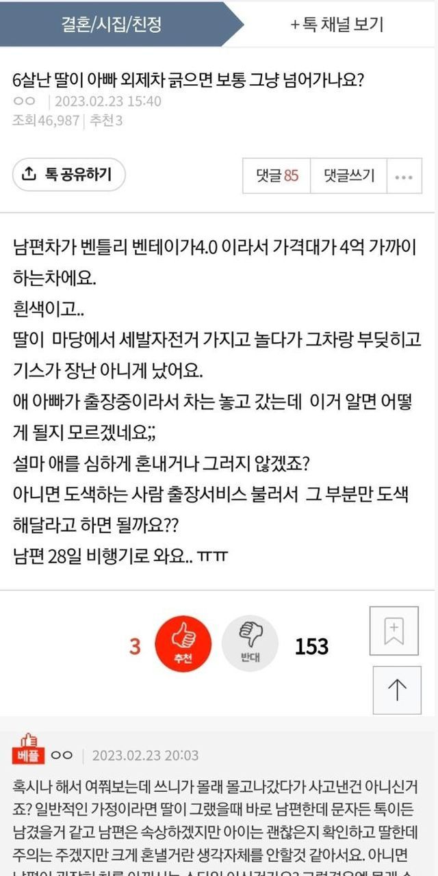 6살 난 딸이 아빠 외제차 긁으면 보통 그냥 넘어가나요? …