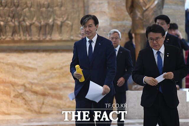 [더팩트ㅣ국회=남윤호 기자] 조국 조국혁신당 대표가 5일 오전 서울 여의도 국회 로텐더홀에서 열린 최고위원회의에 참석해 발언하고 있다.