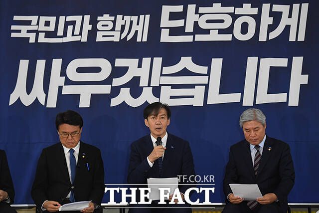 조국 조국혁신당 대표(가운데)가 5일 오전 서울 여의도 국회 로텐더홀에서 열린 최고위원회의에 참석해 발언하고 있다. /국회=남윤호 기자