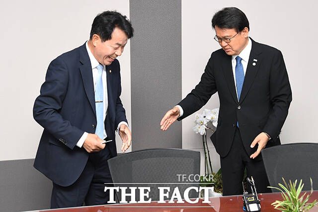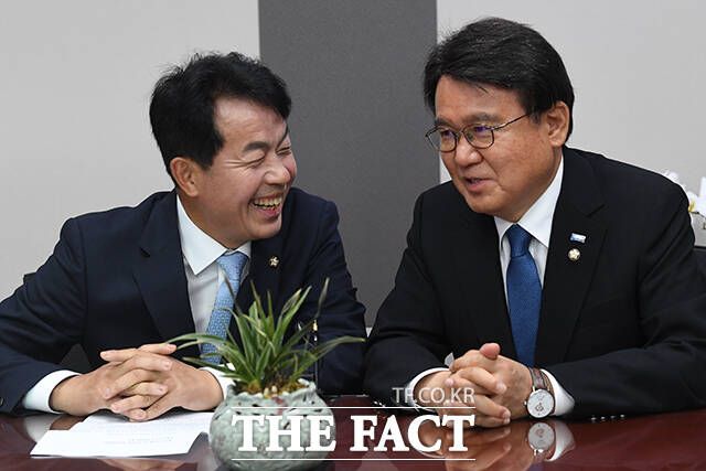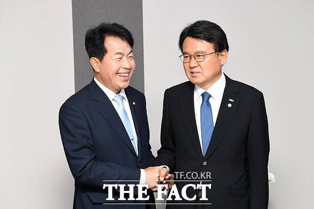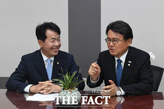 [더팩트ㅣ국회=남윤호 기자] 황운하 조국혁신당 원내대표(오른쪽)가 5일 오전 서울 여의도 국회 의원회관에서 윤종오 진보당 원내대표를 맞아 환담을 나누고 있다.