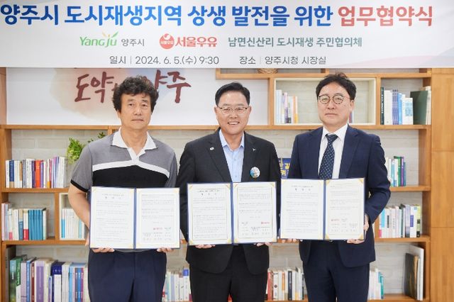 [파이낸셜경제=김영란 기자] 양주시가 5일 오전 시청 시장실에서 남면신산리 도시재생주민협의체, 서울우유양주공장과 함께 남면신산리 도시재생사업의 성공적 추진과 지역 상생 발전을 위한 업무협약을 체결했다.
