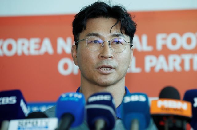 김도훈 감독이 국제축구연맹(FIFA) 북중미 월드컵 아시아예선을 위해 지난 2일 인천국제공항에 도착해 싱가포르로 출국 하기 전 인터뷰를 하고 있다. 김도훈 임시 감독이 이끄는 한국은 오는 6일 오후 9시 싱가포르 더 내셔널 스타디움에서 싱가포르와의 2026 국제축구연맹(FIFA) 북중미 월드컵 아시아에선 C조 조별리그 5차전을 치른다. / 뉴스1