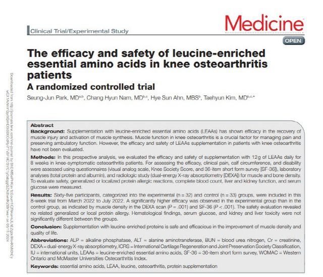 이번 연구성과를 담은 <무릎 골관절염 환자에서 류신이 풍부한 필수아미노산의 효능 및 안전성(the efficacy and safety of leucine-enriched essential amino acids in knee osteoarthritis patients ; a randomized controlled trial)> 제하의 논문은 5월 세계적으로 저명한 SCIE급 국제 학술지인 메디슨(Medicine)에 게재됐다.