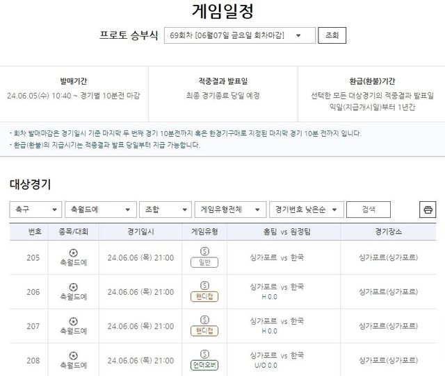 프로토 승부식 69회차 중 이번 A매치를 대상으로 하는 경기는 ▲일반(205번) ▲핸디캡(206번) ▲소수핸디캡(207번) ▲언더오버(208번)의 4가지 방식으로 즐길 수 있으며, 모든 게임은 경기 시작 10분 전인 6일(목) 오후 8시50분까지 구매가 가능하다.