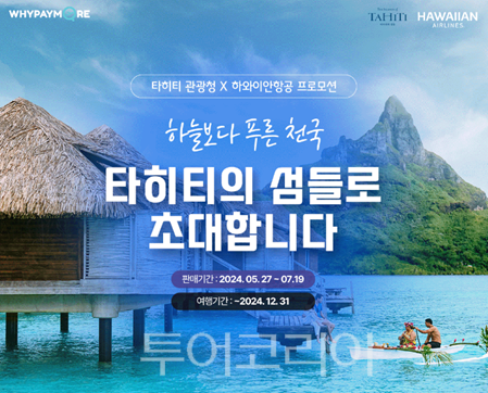 [투어코리아=조성란 기자] 타히티 관광청이 하와이안항공과 협력하여 인천-타히티 노선 특가 프로모션을 진행한다. 이번 프로모션은 와이페이모어와 인터파크 트리플을 통해 오는 7월 19일까지 진행되며, 탑승 기간은 올해 12월 28일까지다.
