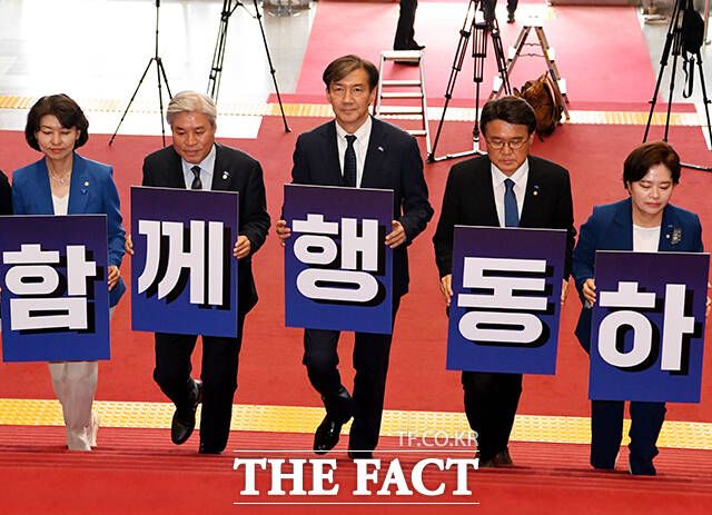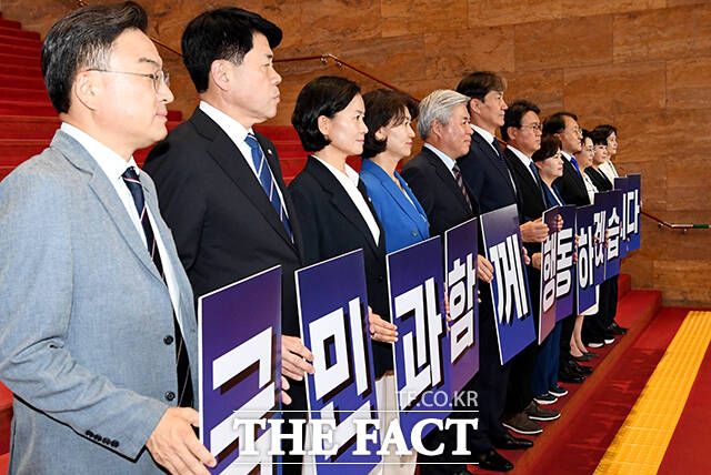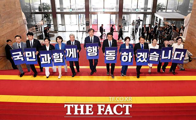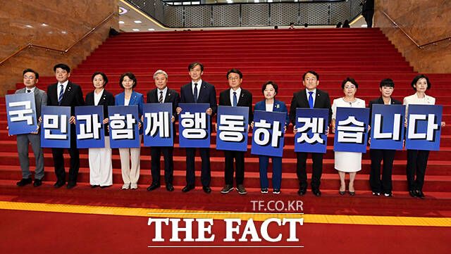 [더팩트ㅣ국회=배정한 기자] 조국 대표(왼쪽 여섯번째)를 비롯한 조국혁신당 의원들이 5일 오후 서울 여의도 국회 로텐더홀에서 '국민과 함께 행동 하겠습니다'라고 적힌 피켓을 들고 본회의장으로 이동하고 있다.