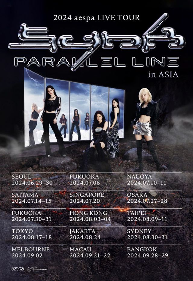 에스파의 두 번째 월드투어 ‘2024 에스파 라이브 투어 - 싱크 : 패러렐 라인’(aespa LIVE TOUR - SYNK : PARALLEL LINE)은 오는 29~30일 서울 잠실 실내체육관을 시작으로, 7월 후쿠오카·나고야·사이타마·싱가포르·오사카, 8월 홍콩·타이베이·도쿄·자카르타·시드니, 9월 멜버른·마카오·방콕 등 아시아 및 호주 총 14개 지역에서 펼쳐진다.