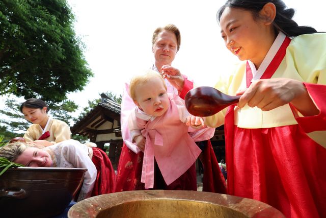 아시아투데이 박상선 기자 = 한국의 4대 명절중 하나인 단오를 닷새 앞둔 5일 서울 종로구 국립민속박물관 오천댁에서 외국인 가족이 창포물에 머리감기를 체험하고 있다.