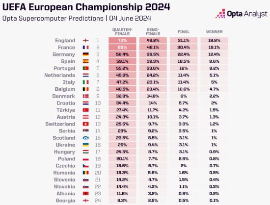 축구통계매체 '옵타'는 지난 4일(한국시간) 1만 번의 시뮬레이션을 통해 슈퍼컴퓨터가 예측한 유로 2024 우승 확률을 공개했다. 우승 확률이 가장 높은 국가는 19.9%를 차지한 잉글랜드였고 프랑스가 19.1%로 뒤를 이었다. 지난 대회 우승팀 이탈리아의 우승 확률은 5%밖에 되지 않았다.