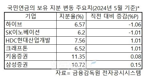 5일 금융감독원 전자공시시스템에 공시된 2024년 5월 기준 '임원·주요주주 특정증권 등 소유상황보고서', '주식 등의 대량보유상황 보고서'를 종합하면, 국민연금은 지난 5월 31일 기준으로 하이브 주식을 43만8898주를 매도했다. 국민연금은 2024년 3월말 기준 하이브의 3대 주주였다. 이로써 국민연금의 하이브 지분율은 직전 7.63%에서 6.57%로 줄었다. 감소분이 1.06%p다.