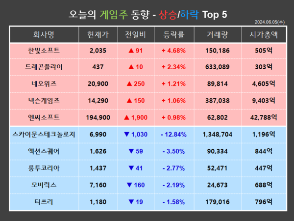 한빛소프트가 금일(5일) 전거래일 대비 4.68%(91원) 상승한 2,035원에 거래를 마쳤다. 개인이 19,821주를 순매도한 반면, 외국인이 19,901주를 순매수하며 장 초반부터 급등해 상승장으로 마감했다.