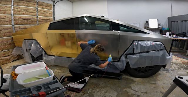 그러나 유튜브 채널 ‘JerryRigEverything’에서는 과감하게 24K 순금을 활용해 사이버트럭을 도금했다. 트럭은 3단계로 도금됐는데, 먼저 ‘초경질 냉간압연’ 스테인리스 스틸 패널을 친수성화하기 위해 전기세정기를 사용했다. 그는 전기의 도움으로 픽업트럭의 외부를 매우 건조하게 만들어 전도성을 유지했다.