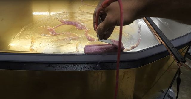 셋째 실제 도금은 24K 순금과 코발트의 혼합으로 시작됐다. 유튜버는 백금 도금된 티타늄 브러시를 양극으로 사용하고 얇은 금판이 있는 자기 음극 구리 전극(일명 음극)을 사용해 차량을 금도금했다.