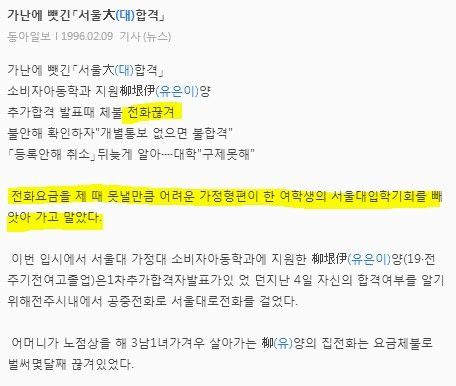 1996년 서울대 추합했는데 가난한 형편에 전화비를 못내서 집전화가 끊겨 추합 전화를 못받음