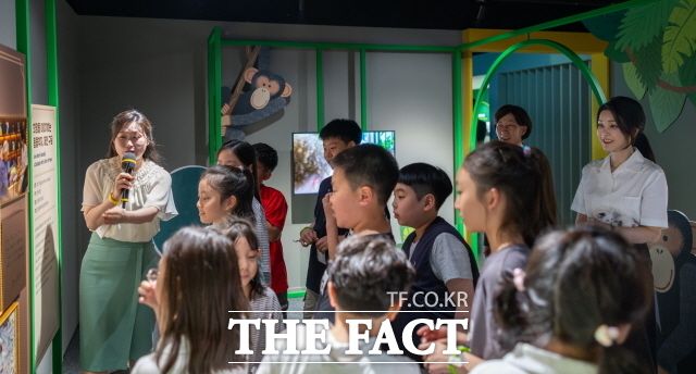 윤석열 대통령 부인 김건희 여사가 5일 서울 용산어린이정원 열린 어린이 환경·생태교육관 개관식에 참석했다. 교육관 내에 마련된 제인 구달 박사를 기념하는 특별관을 학생들과 함께 관람하며 제인 구달 박사의 환경 보호 활동 여정에 대해 듣고 있다. /대통령실 제공