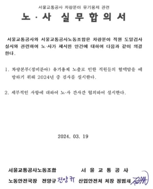 '서울교통공사노동조합 노동안전국장 전양규'와 '서울교통공사 산업안전처 처장 정범채'의 서명이 담긴 3월 19일 자 합의서에는 '차량본부(정비분야) 유기용제 노출로 인한 직원들의 혈액암을 예방하기 위해 2024년 중 검사를 실시한다'와 '세부적인 사항에 대하여 노·사 간사간 협의하여 실시한다'는 내용이 담겼다.