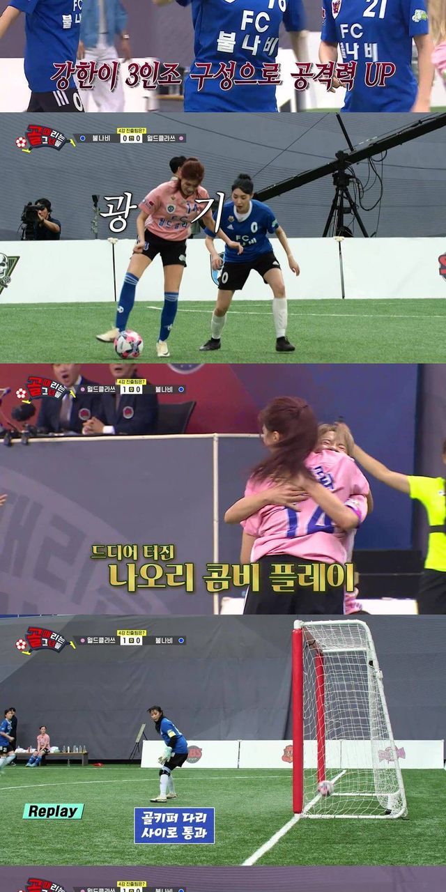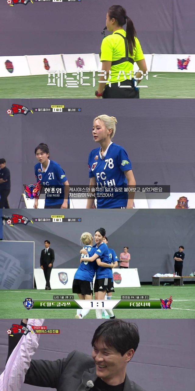 후반 3분, 집념으로 공을 살린 사오리의 패스를 받은 나티가 기습 슈팅으로 선제골을 만들어냈다. 후반전 경기를 주도했으나 오히려 선제골을 내준 ‘불나비’는 서로를 격려하며 다시 기회를 만들기 위해 노력했다. 이어 ‘월드클라쓰’의 핸드볼 파울로 ‘불나비’에게 페널티킥 기회가 찾아왔고, 한초임이 깔끔한 슈팅으로 골을 넣어 승부를 원점으로 되돌렸다.